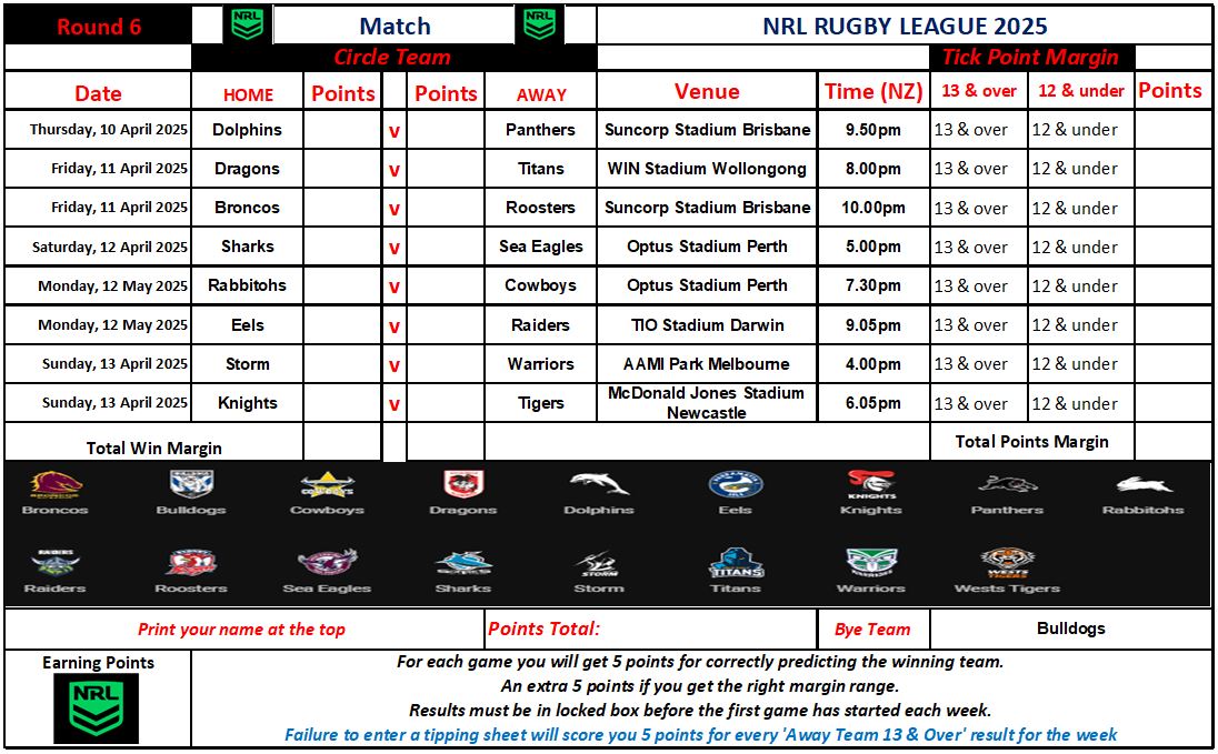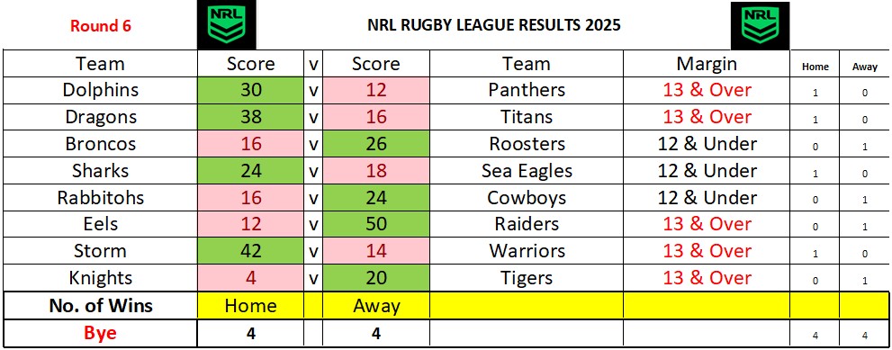 NRL Sports Tipping – Round 6 Weekly Draw & Results