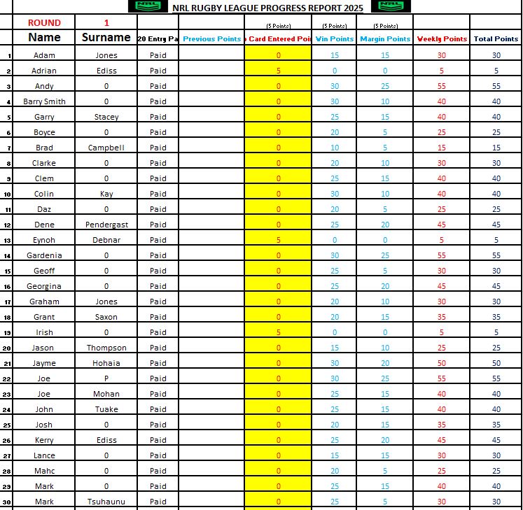 NRL Sports Tipping – Round 1 Weekly Draw & Results