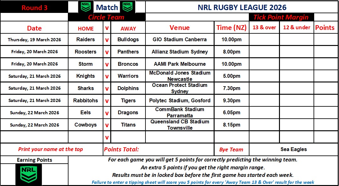 NRL Sports Tipping – Round 3 Weekly Draw & Results