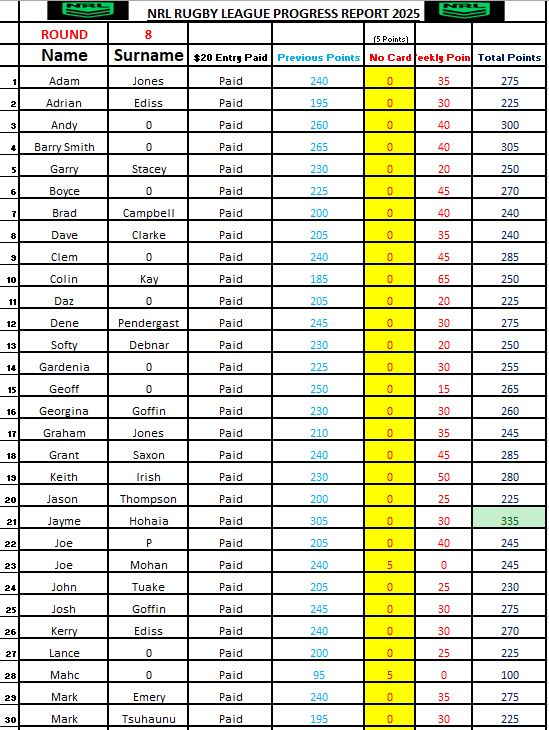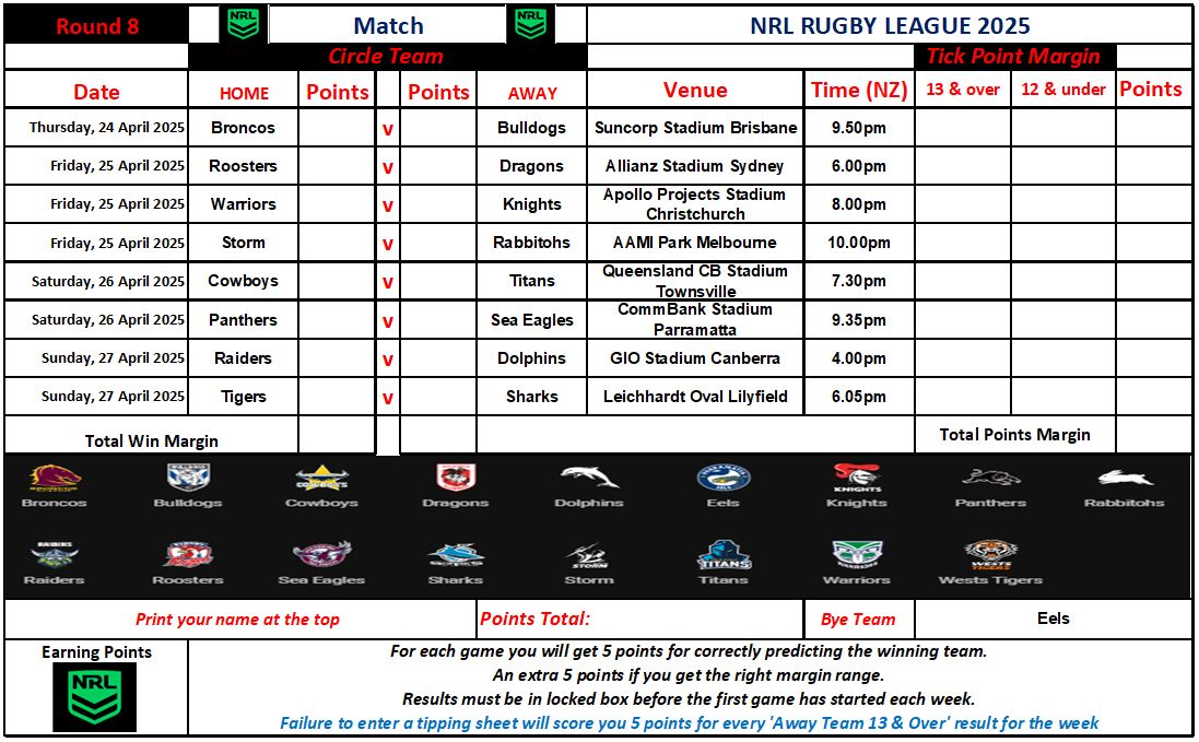 NRL Sports Tipping – Round 8 Weekly Draw & Results