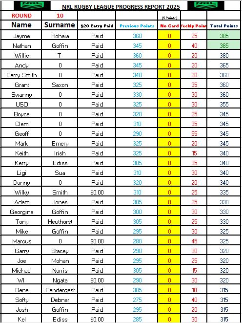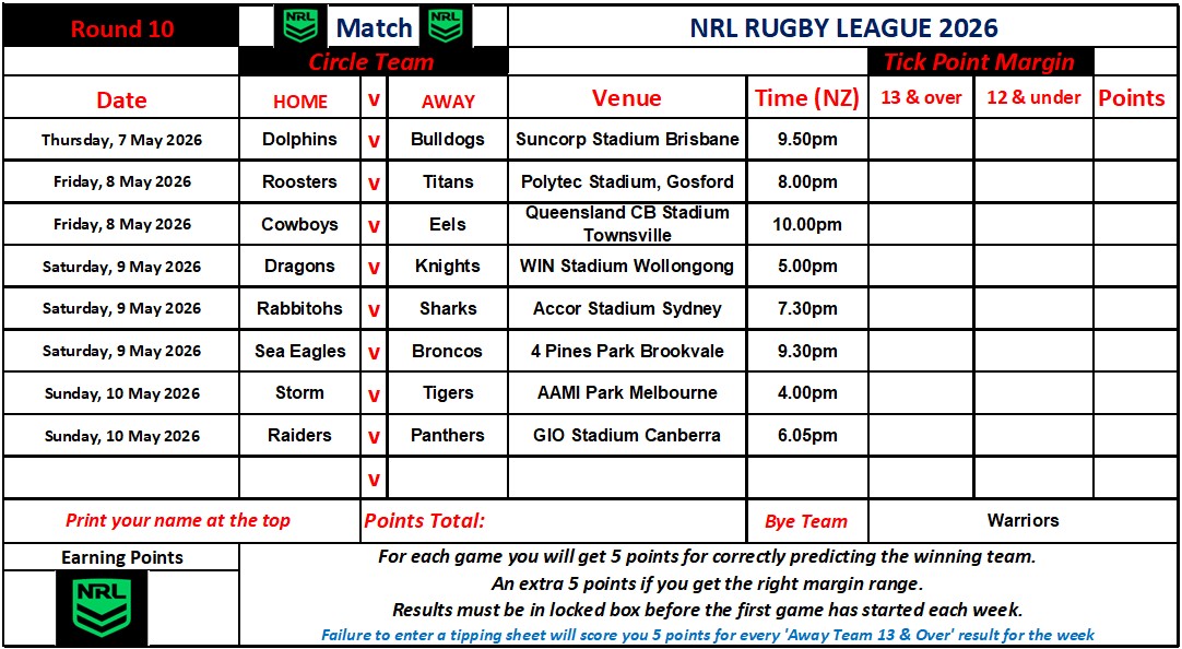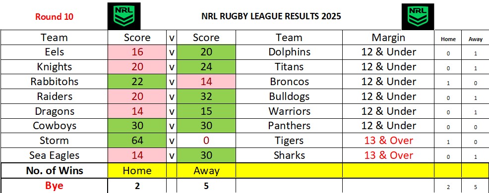 NRL Sports Tipping – Round 10 Weekly Draw & Results