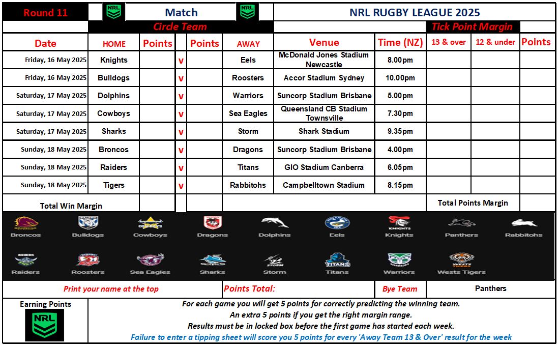 NRL Sports Tipping – Round 11 Weekly Draw & Results