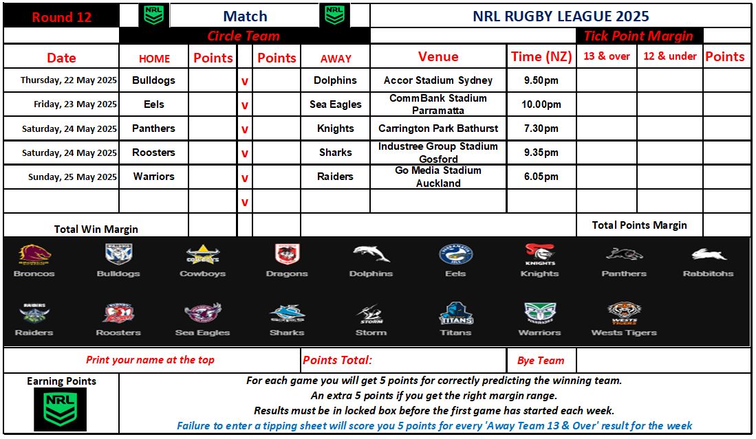 NRL Sports Tipping – Round 12 Weekly Draw & Results