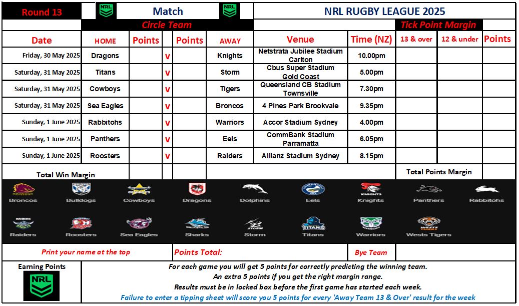 NRL Sports Tipping – Round 13 Weekly Draw & Results