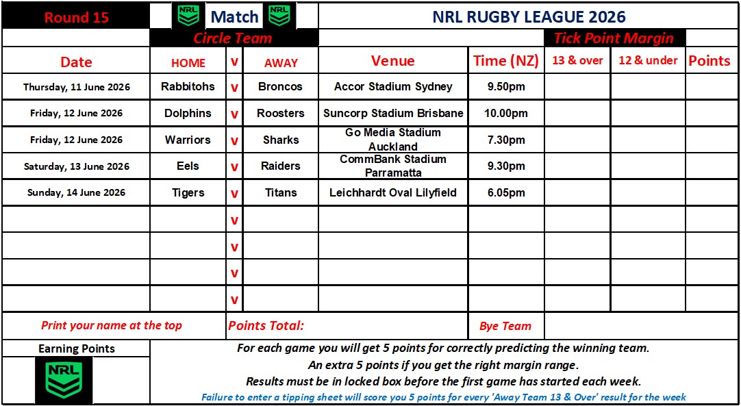 NRL Sports Tipping – Round 15 Weekly Draw & Results