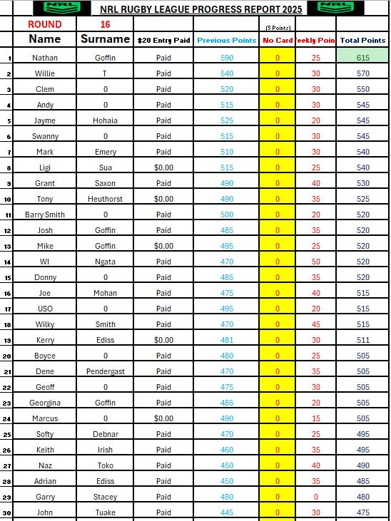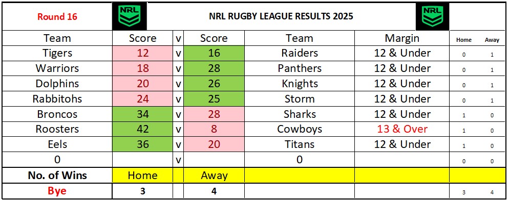 NRL Sports Tipping – Round 16 Weekly Draw & Results