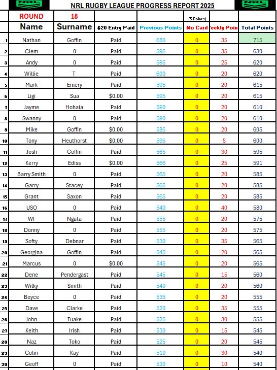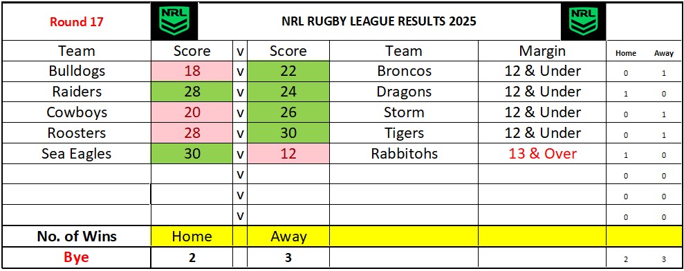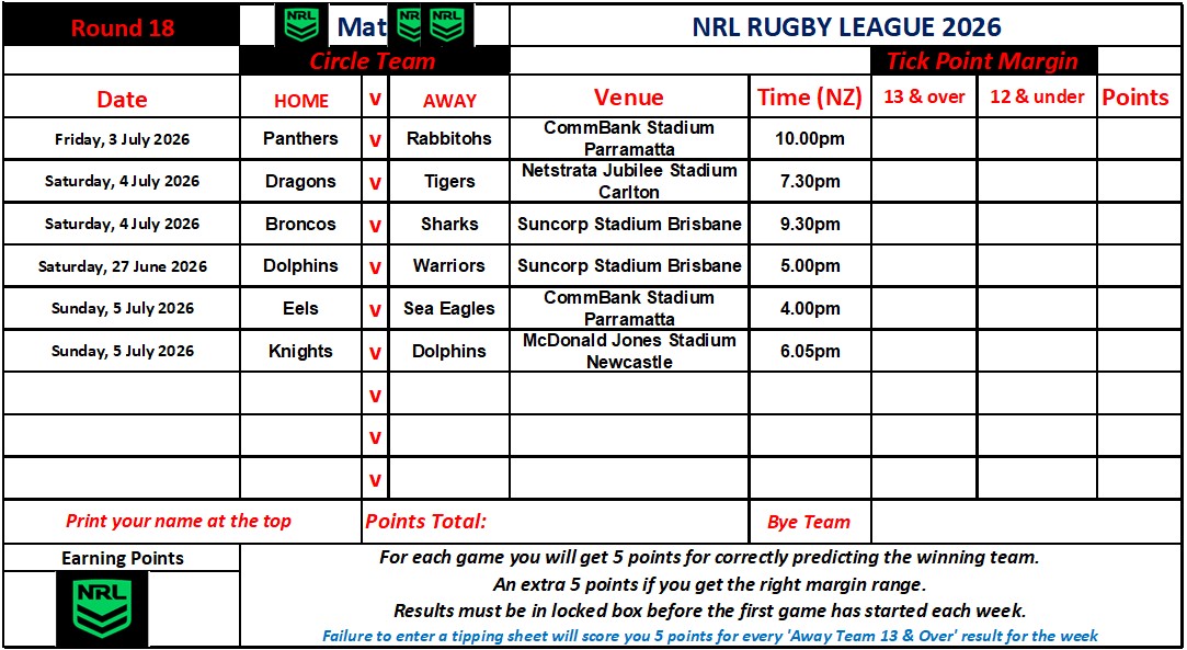 NRL Sports Tipping – Round 18 Weekly Draw & Results