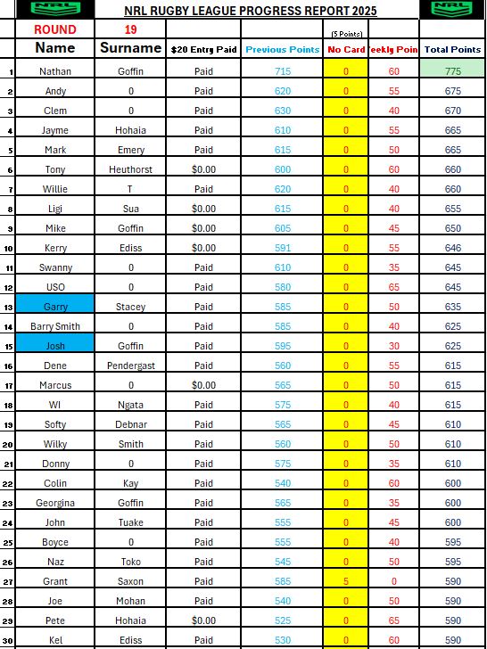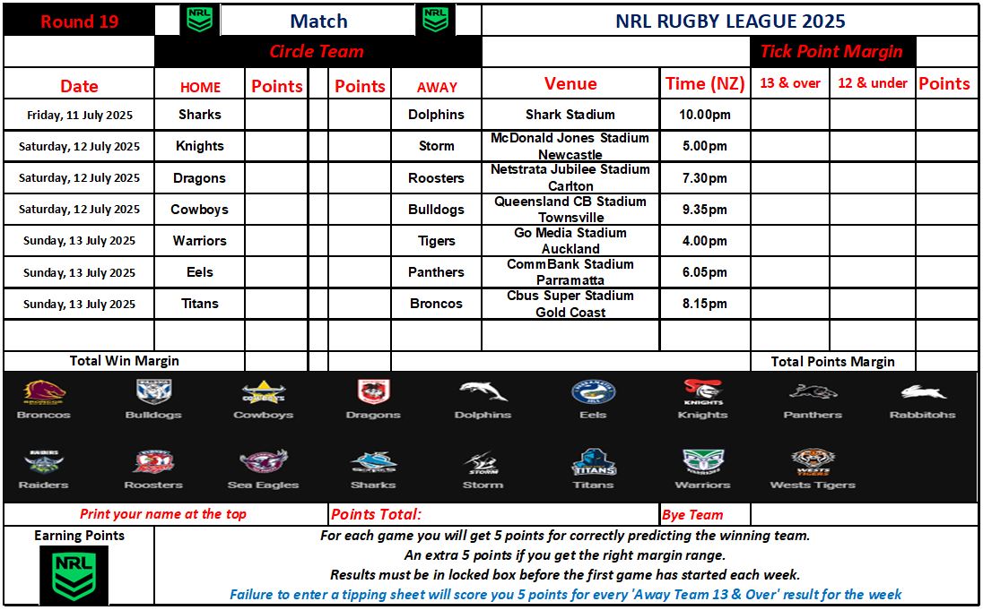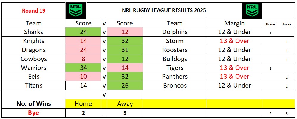 NRL Sports Tipping – Round 19 Weekly Draw & Results