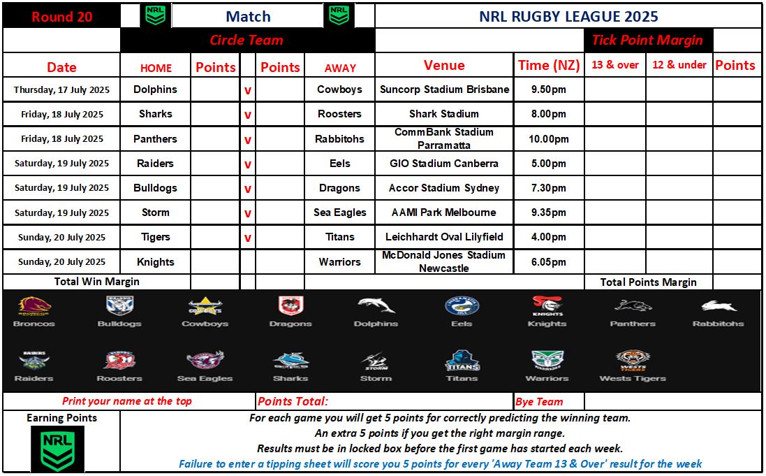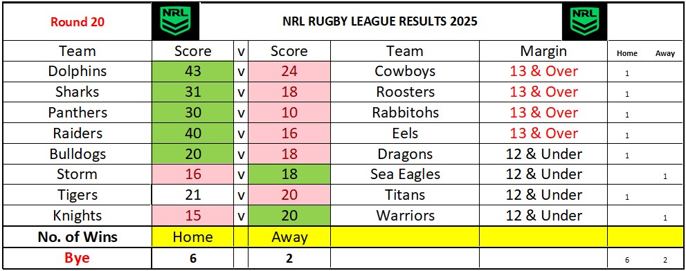 NRL Sports Tipping – Round 20 Weekly Draw & Results
