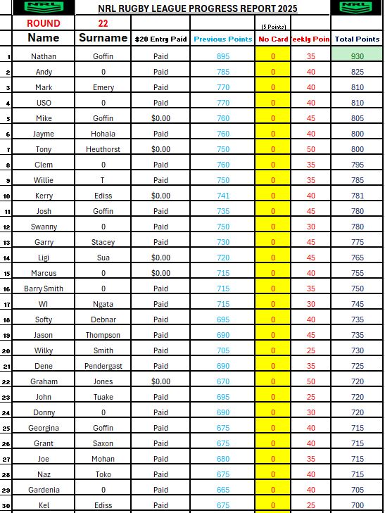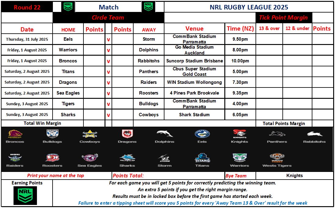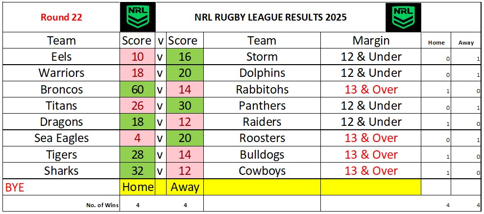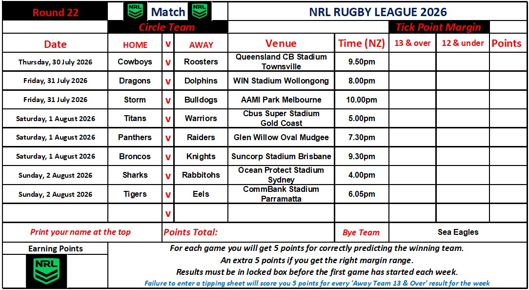 NRL Sports Tipping – Round 22 Weekly Draw & Results