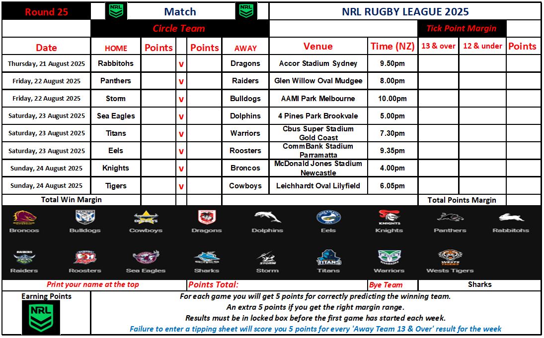 NRL Sports Tipping – Round 25 Weekly Draw & Results
