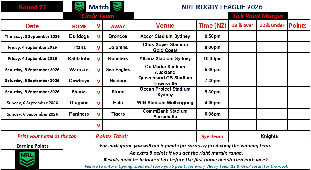 NRL Sports Tipping – Round 27 Weekly Draw & Results