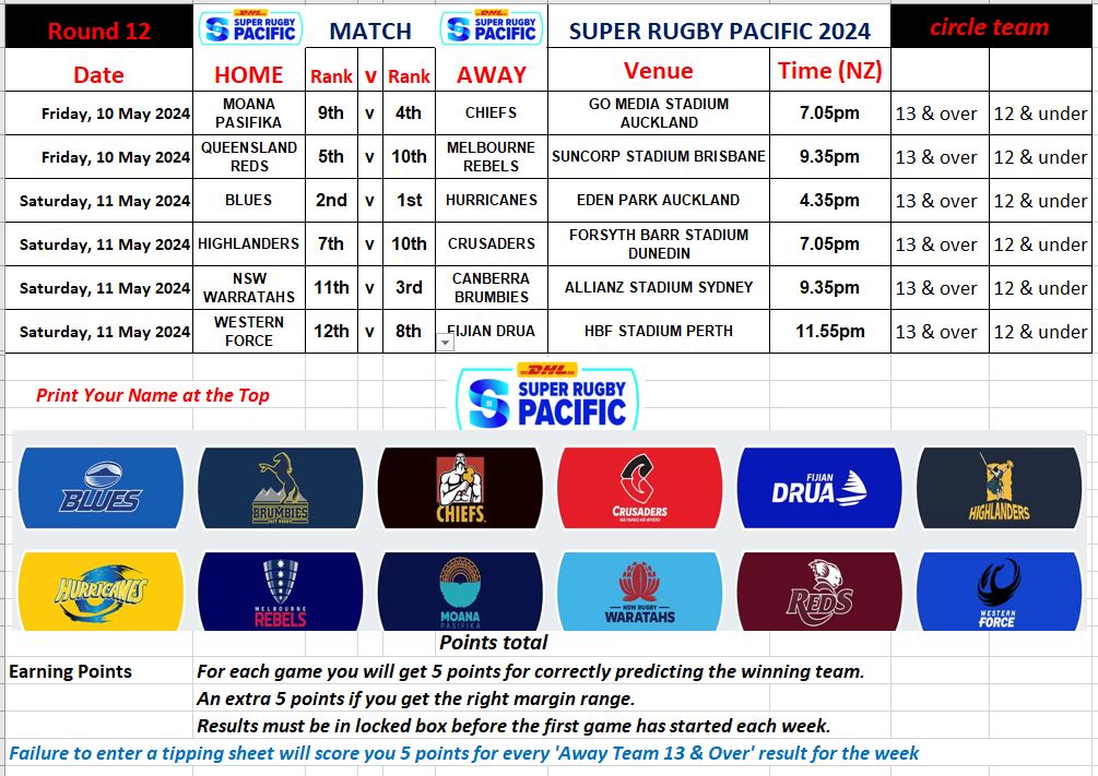 Super Rugby Pacific Sports Tipping Round 12 Weekly Draw & Results