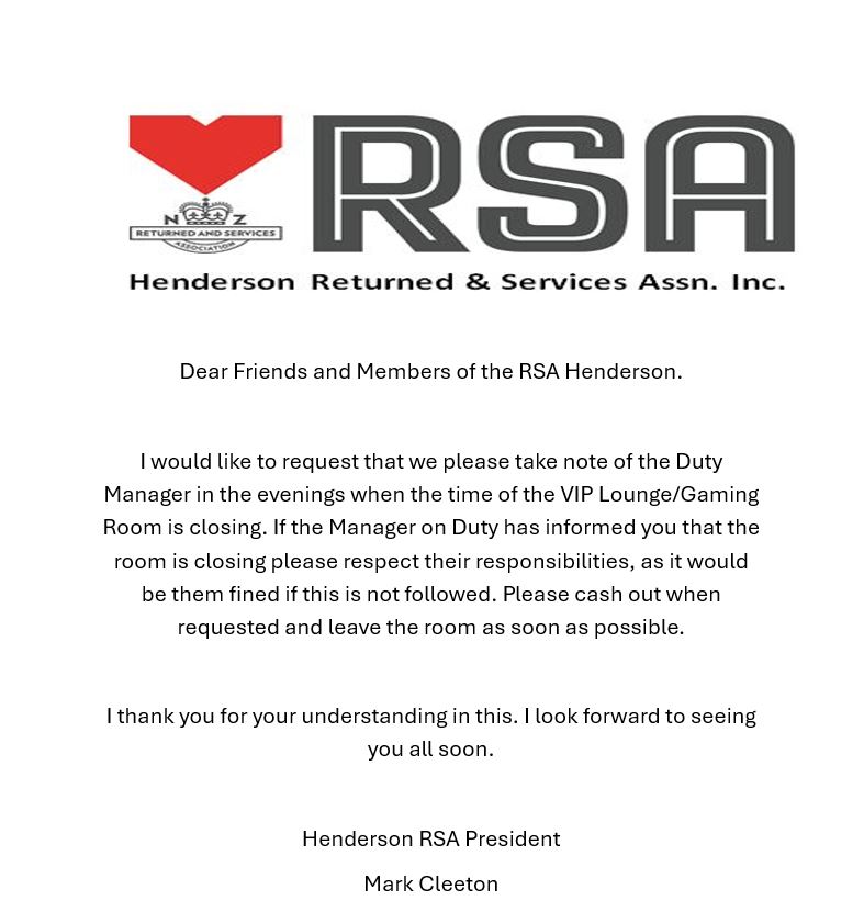 Please contact the Secretary Manager if you would like to discuss advertising in the Henderson RSA Newsletter, or on our in house screen advertising.