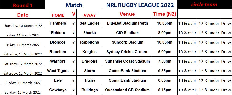 THE NRL RUGBY LEAGUE SPORTS TIPPING COMPETITION STARTS THIS THURSDAY 10TH MARCH 2022