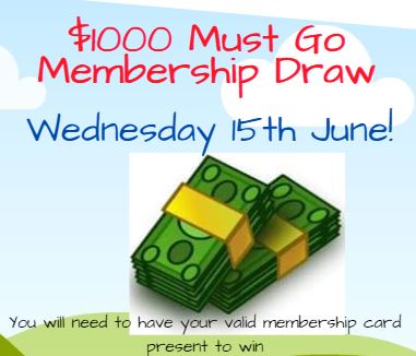 Both Membership Draws jackpot up to $1000 every 10 weeks when they must go! Membership Draw starts at 6:30pm on Wednesday and 6:30pm on Friday
