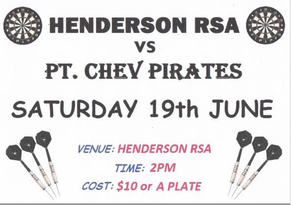 Henderson RSA versus Pt. Chev Pirates  this Saturday 19th June at the Club. Bring a Plate or $10.00 Entry Fee