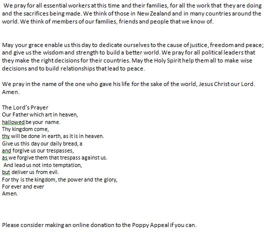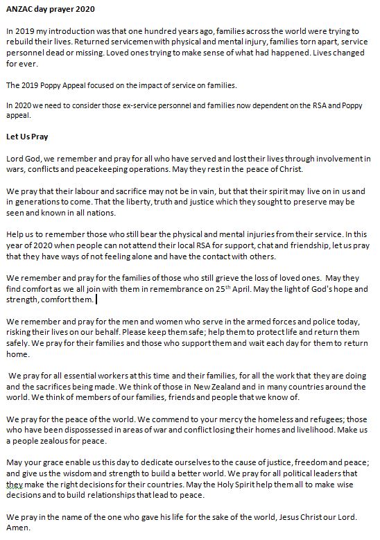 We are pleased to offer you some short prayers from Moira Saunders who normally presides over our ANZAC Day Service every year and has kindly put this together for us.