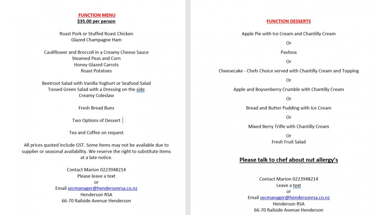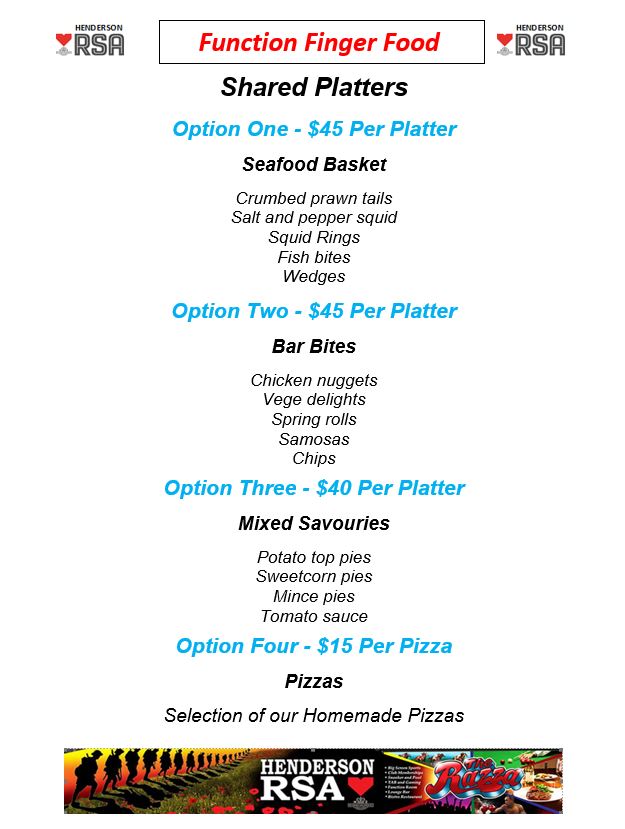 Please contact the Club Manager by email at secmanager@hendersonrsa.co.nz or phone on 021927552 for further information and check out our Function Request Package and pictures of each area and a booking calendar through the Venue Hire page.